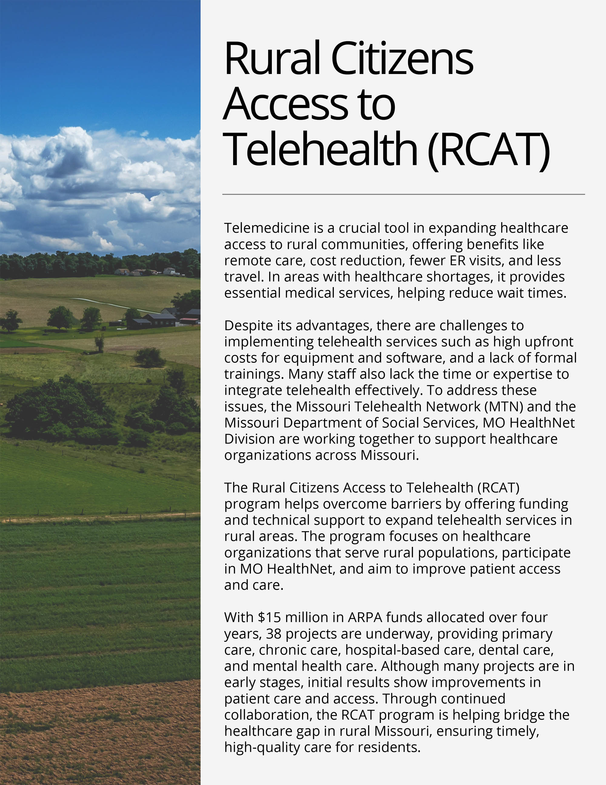RCAT is a partnership between the Missouri Telehealth Network (MTN) and the MO Department of Social Services, MO HealthNet Division. MTN will identify and survey stakeholders to discuss barriers. Then, provide telehealth education and training, technical assistance in project planning, and funds for new telehealth programs to increase access for rural Missourians.