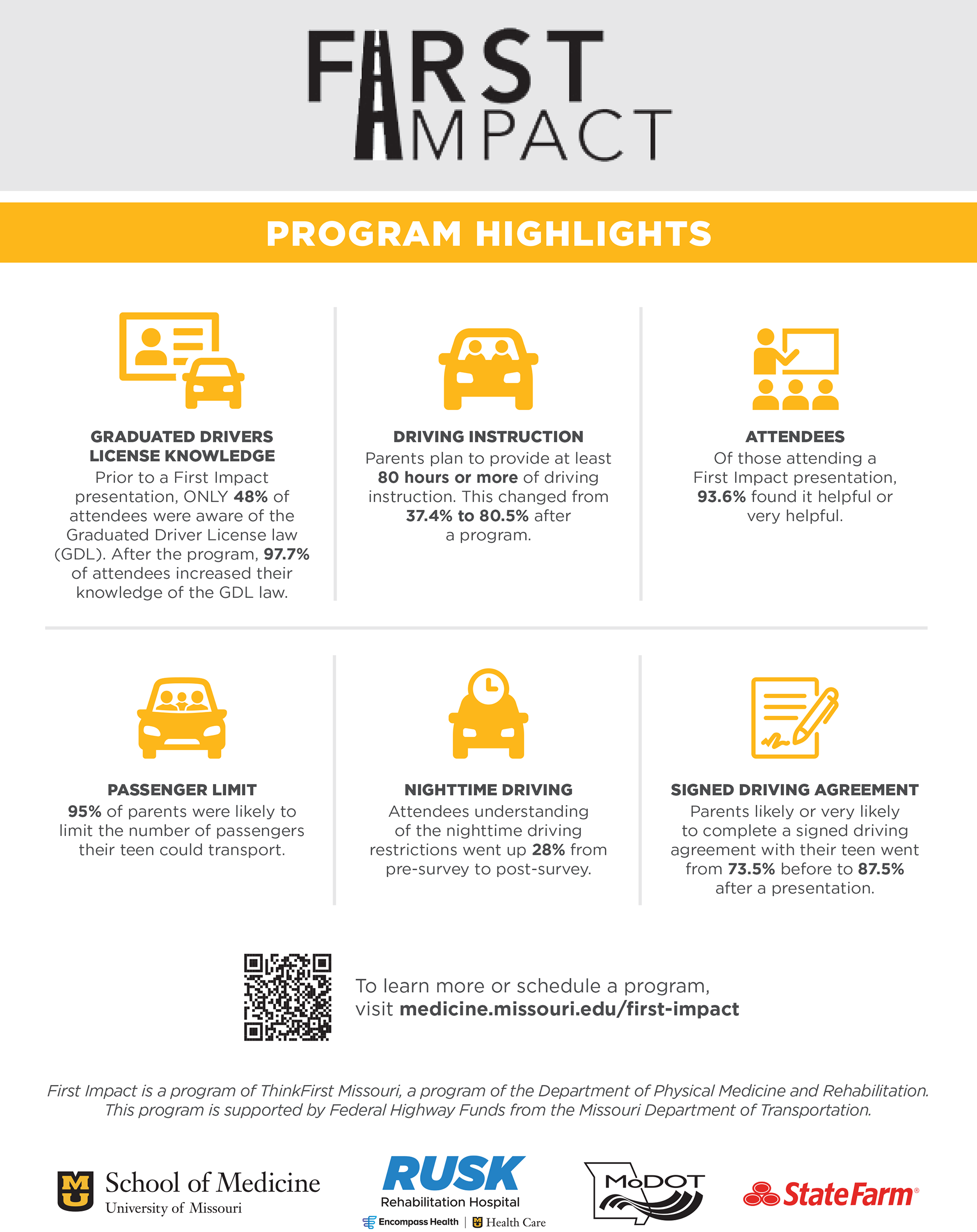 First Impact offers a FREE 90-minute evidence-based traffic safety program that educates parents and teen drivers about Missouri’s GDL law. The goal of First Impact is to reduce the number of motor vehicle fatalities, injuries and crashes among teen drivers by increasing parental awareness and enforcement of Missouri’s GDL law.